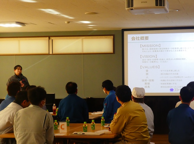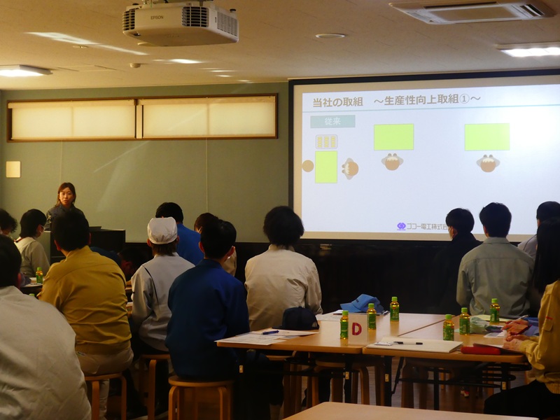まず、営業担当から当社の概要を説明し、社長が改善の取り組み内容などを発表いたしました。